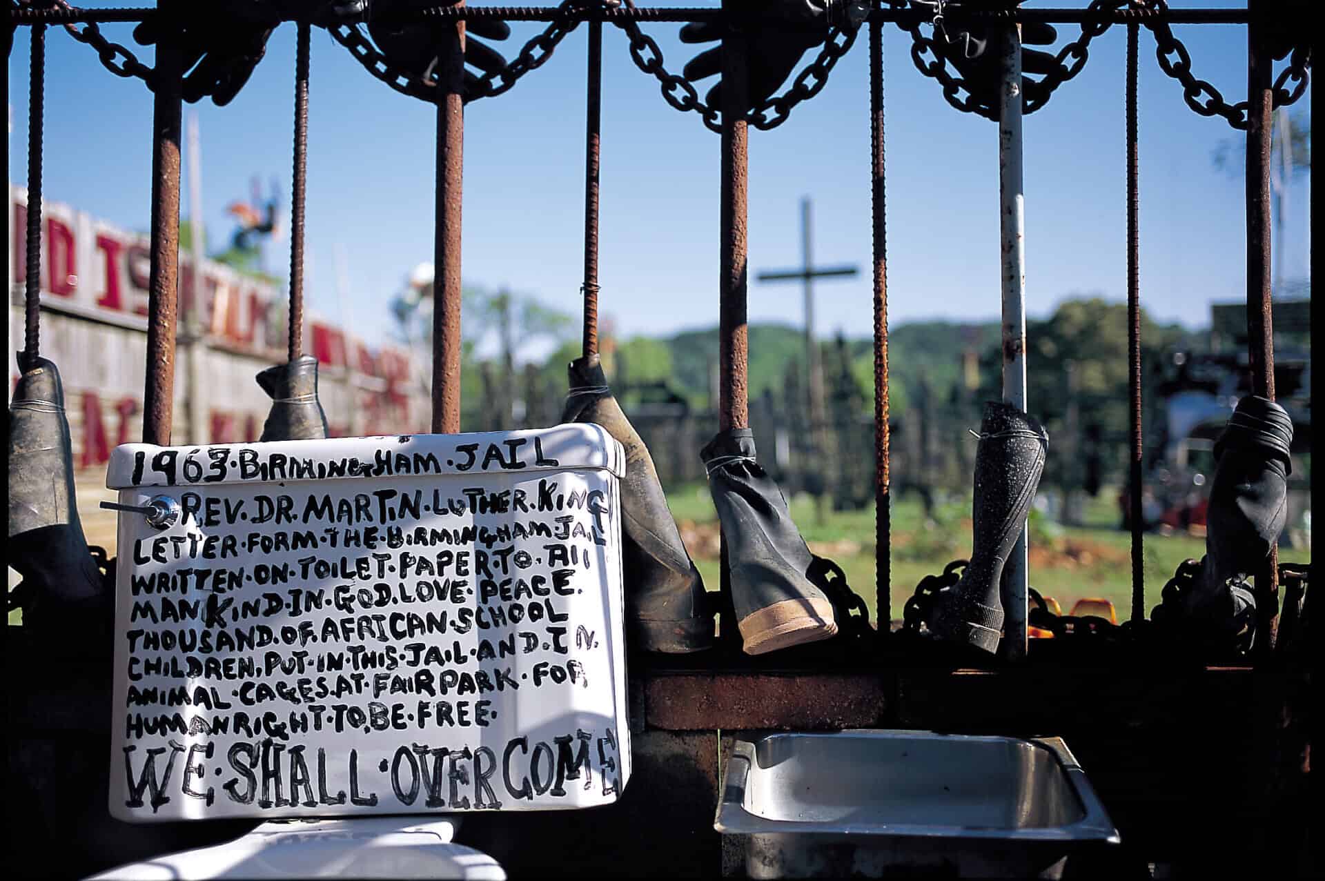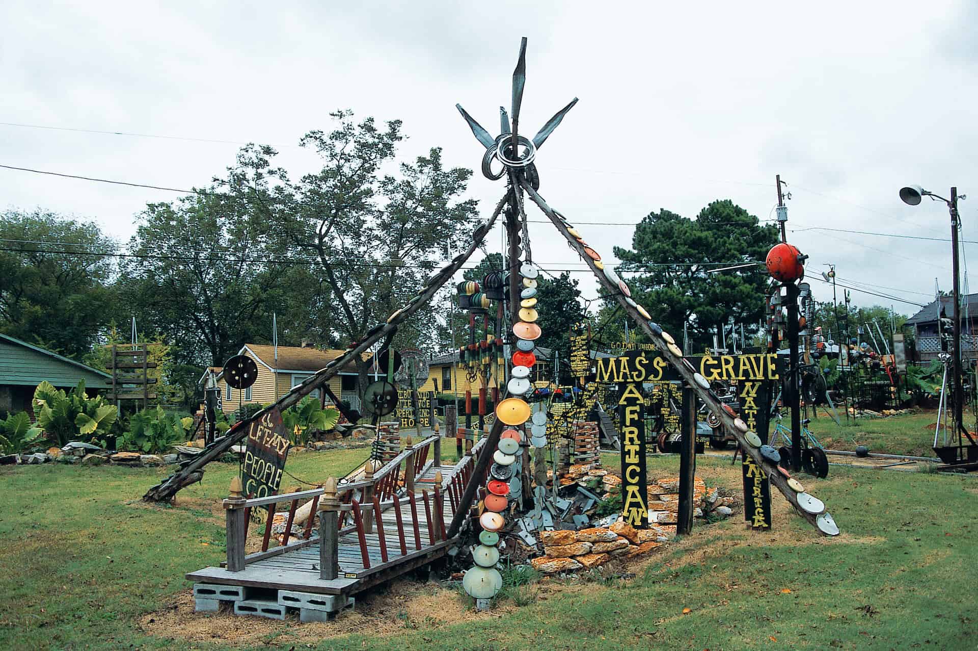 The original display contexts for Holley’s work (1980s and 1990s) were not official, art-designated spaces, but his own home and yard, which ultimately contained hundreds of works addressing historical, philosophical, and psychological topics. While Holley has discovered influences within fine-art traditions, his “yard show” (which was destroyed in the late 1990s) also drew extensively from aesthetic resources within his Southern Black culture. The category of yard art itself is a generations-old form of expression and presentation, seen throughout the American South and the African diaspora, that has afforded many Black artists an indigenous tradition resembling, yet ultimately distinct from, modern-art forms of assemblage and installation art.