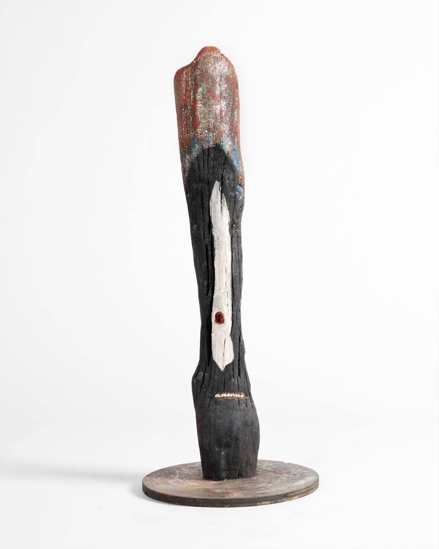 Lonnie Holley (b. 1950) made his first artworks—carved sandstone grave markers—as devotional tributes to two young relatives killed in a house fire. He was soon creating around the clock, and during visits to his local museum in Birmingham, Alabama, became enamored with Ancient Egyptian art, particularly its profile human faces and its use in honoring the dead. Relentlessly experimental, Holley has gone on to work in media ranging from sandstone carving, oil and acrylic painting, metal-wire mobiles and stabiles, drawing, found-object assemblage, cast-metal sculpture, and even computer-assisted images—on a scale stretching from the miniature to the monumental.